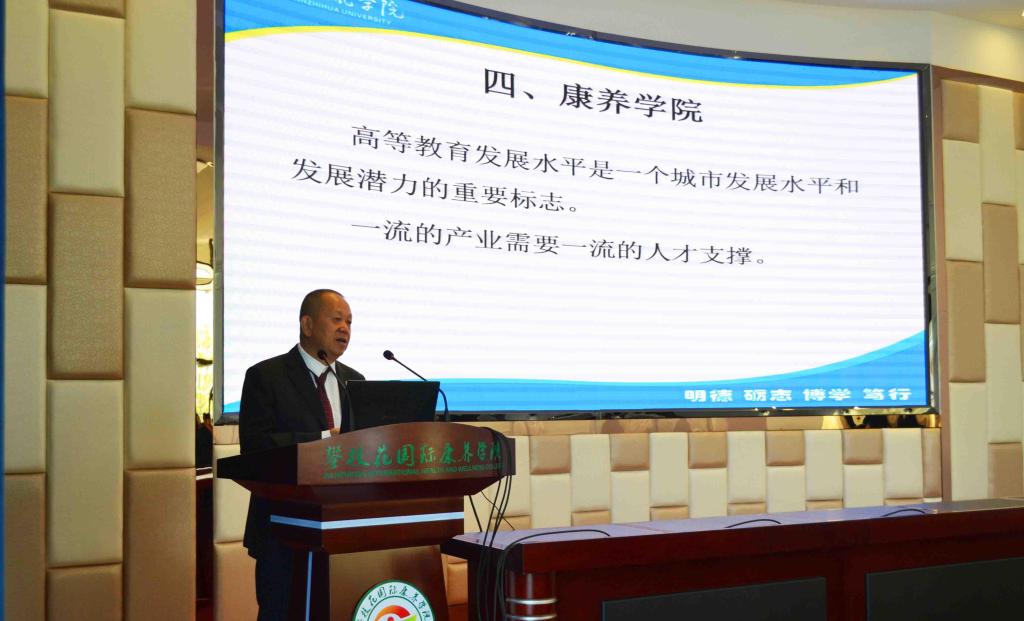 我校党委书记肖立军讲话。他指出,我校肩负着为地方经济社会发展培养高素质人才的重要使命,未来将以把康养学院建设成为一所集康养学历教育、科学研究、职业技能训练、国际交流合作为一体的国际化特色学院为目标,不断深化教育教学综合改革,积极推动学校转型发展,努力提升学校应用型人才培养质量和服务地方经济社会发展能力。