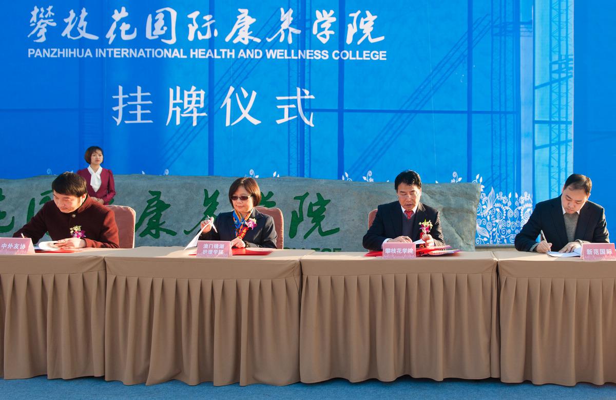 市委常委、副市长黄岳槐宣读了《攀枝花市人民政府关于同意成立攀枝花国际康养学院、攀枝花康养研究院和攀枝花康养职业技能实训基地的批复》;省社会科学院副院长杨钢、省发改委调研员何萍为“攀枝花康养研究院”授牌;省旅发委调研员占凤琪、省中医药管理局副局长罗建为“攀枝花康养职业技能实训基地”授牌;我校党委副书记、校长黄双华代表康养学院与澳门镜湖护理学院、中德护士(护理)交流、欧文国际(香港)教育分别签订合作办学及学术合作交流协议。