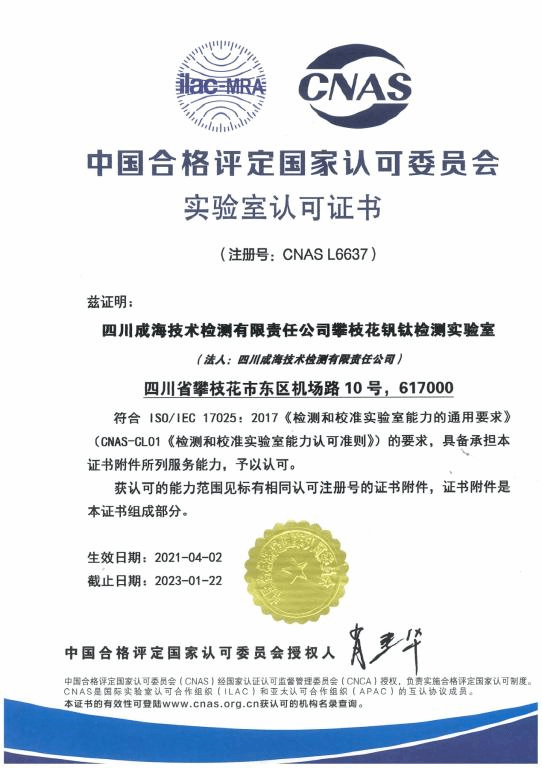 近日,通过CNAS认可的“复评审+扩项”现场评审,我校国家钒钛检测重点实验室(四川成海技术检测有限责任公司攀枝花钒钛检测实验室)再次获得中国合格评定国家认可委员会的实验室认可证书(CNAS),有效期从2021年4月2日至2023年1月22日。